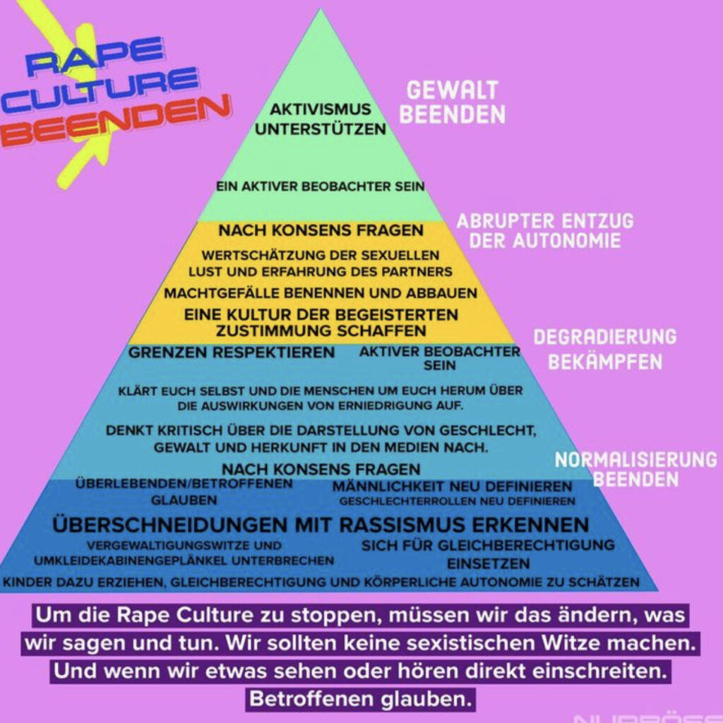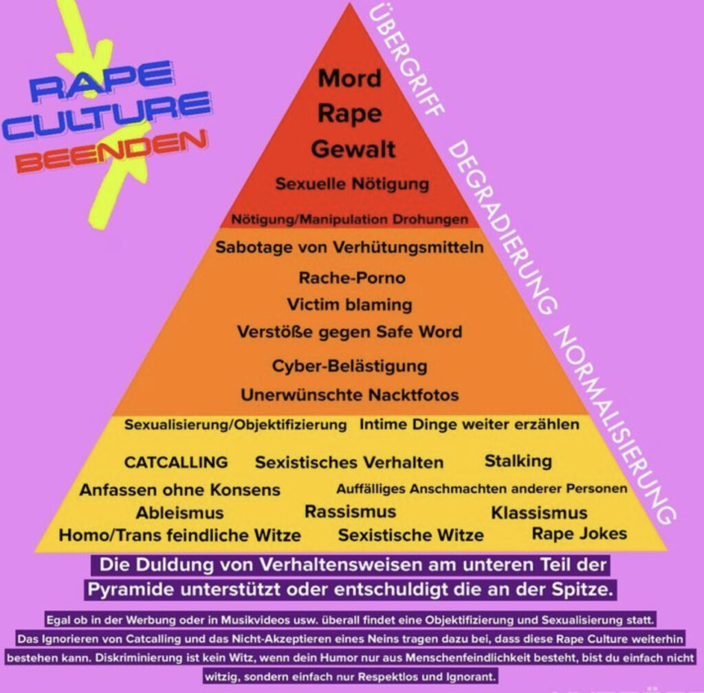 Die „Rape Culture“ beschreibt ein soziales Umfeld, in dem sexuelle Gewalt verharmlost, gerechtfertigt oder sogar indirekt unterstützt wird. Es bezieht sich auf gesellschaftliche Normen, die Täter entlasten und Betroffen beschuldigen, sowie auf eine Kultur, die Vergewaltigung und sexuelle Übergriffe normalisiert oder bagatellisiert. Diese Haltung kann zu einer Umgebung führen, in der sexuelle Gewalttaten nicht angemessen verfolgt oder bekämpft werden.
